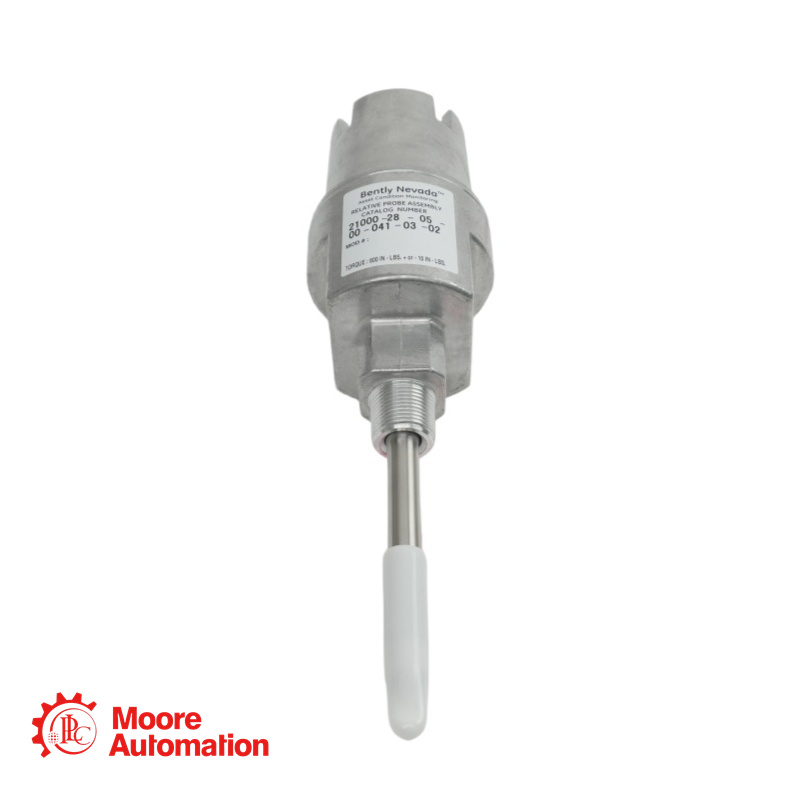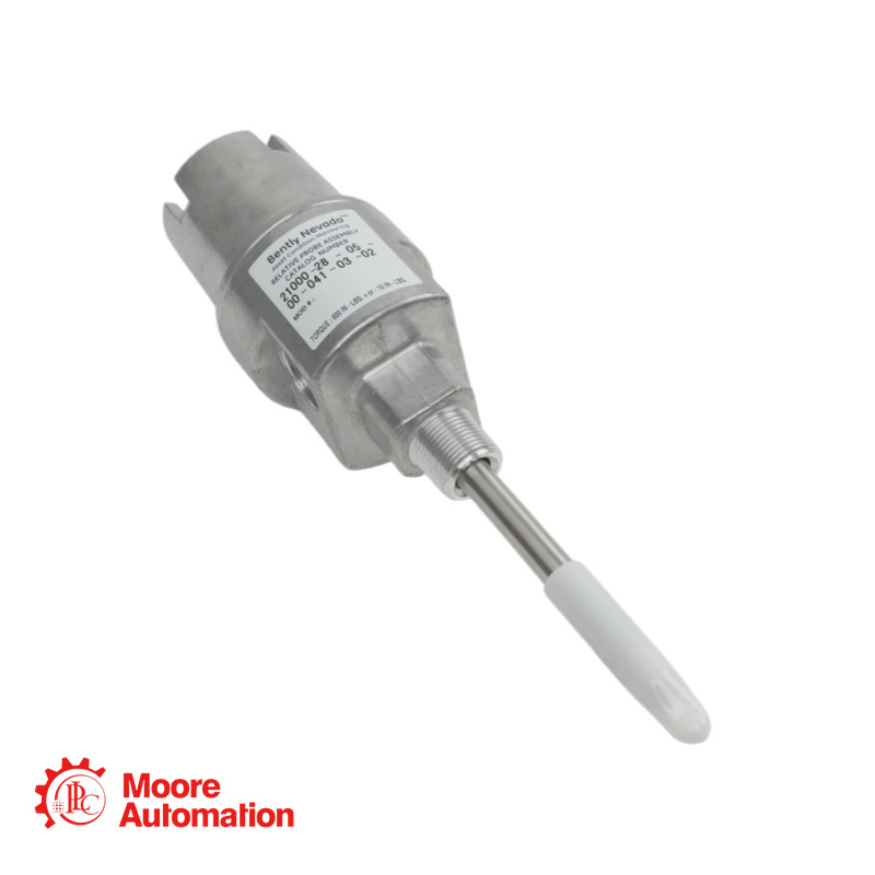This is a 21000 Proximity Probe Housing Assembly manufactured by Bently Nevada (Baker Hughes). 21000-28-05-00-021-03-02assembly features a flush mount configuration (no standoff) with a 2.1-inch probe penetration length. It includes a 3/4-14 NPT mounting thread and Option 03 conduit fitting kit for field termination.