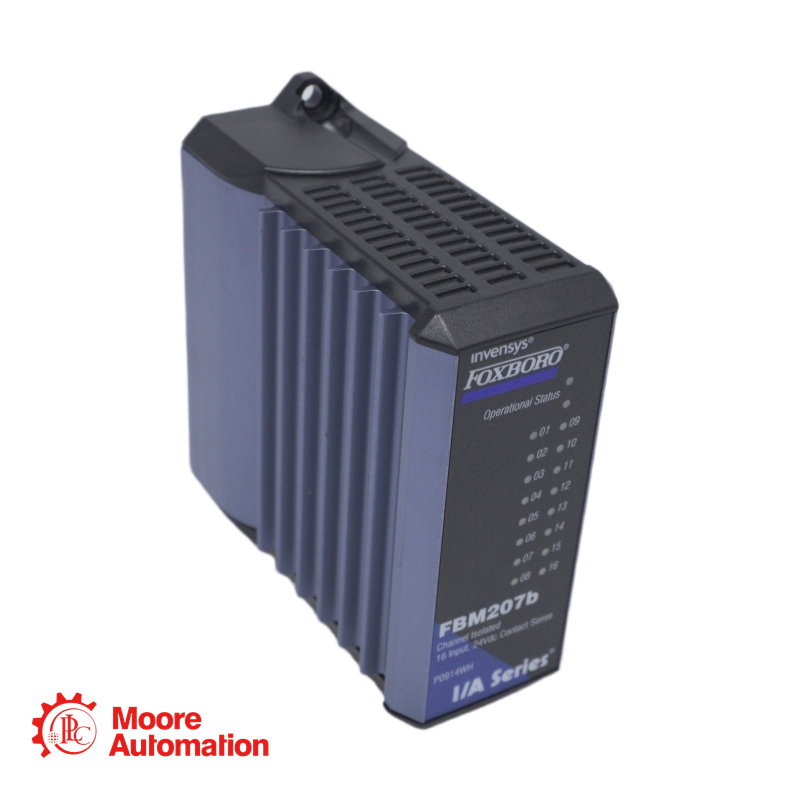 The FBM207B RH914WH is a 16-channel discrete input module designed for contact sense applications using 24 V DC external field contacts. It performs signal conversion required to interface electrical input signals from field sensors to the redundant module Fieldbus. The module executes programs for Discrete Input, Ladder Logic, Pulse Count, and Sequence of Events (SOE), with configurable Input Filter Time options. It can be used as a single unit or as a redundant pair.