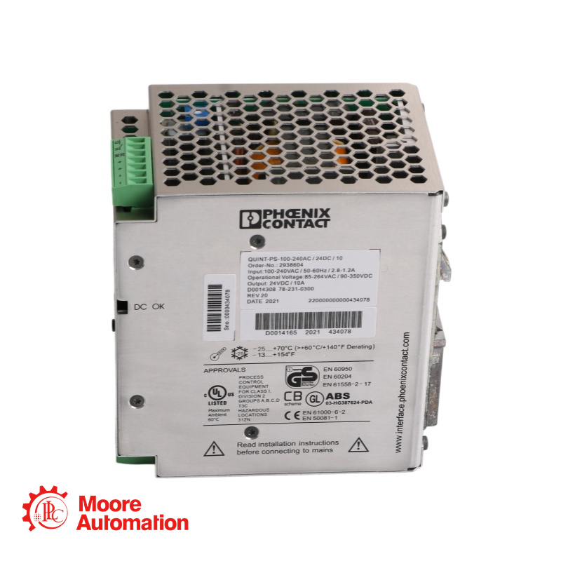 QUINT-PS100-240AC/24DC/10 2938604 power supply units for plant and special engineering reliably start heavy loads with high inrush currents using the POWER BOOST. Thanks to the wide-range input and extensive package of approvals, they can be used in all sectors of industry the world over. The switching output or floating relay contact are used for remote diagnostics.